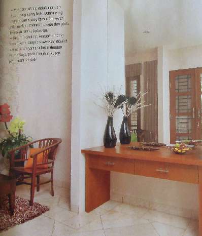 - Ruang tamu bersebelahan dengan Foyer, yang di tandai oleh penempatan meja konsol. Dinding berlapis wallcover motif bunga menjadi focal point ruang yang cantik ini.