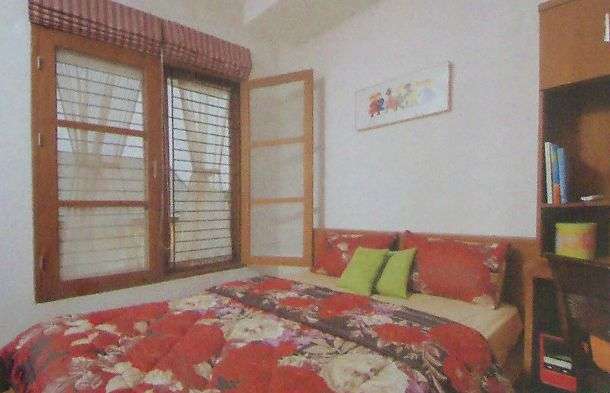 - Kamar tidur berlantai kayu ini dilengkapi furnitur kayu solid. Kusen jendela diberi warna senada dengan warna furnitur.
