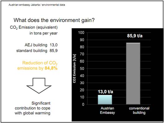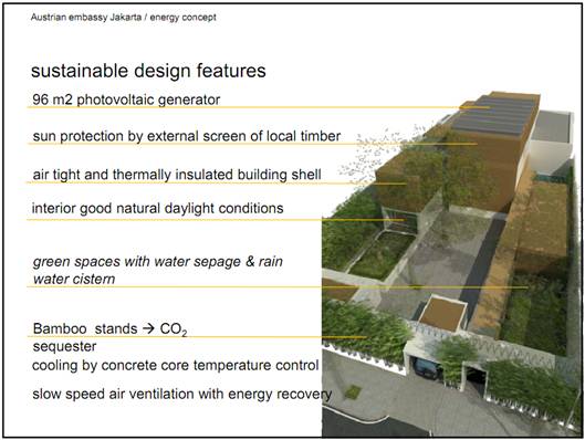 Pandhit Wirawan dari PT. PP mengatakan bahwa aplikasi dari teknologi hijau dapat mereduksi penggunaan energi mencapai 75%. Bangunan konvensional menggunakan energi 110 kVa (kilovolt-amperes), sedangkan bangunan ini hanya menggunakan energi 60 kVa. Desain dari bangunan ini menggunakan prinsip effective shading (akibat adanya atap yang menggantung dan wooden screen) yang memungkinkan cahaya dan suhu alami yang cukup untuk setiap ruangan. Selain itu, jendela-jendela secara hati-hati diorientasikan pada arah utara-selatan untuk mengurangi beban termal dari sinar matahari. Hal ini dapat dilihat pada Gambar 2. Kebanyakan ruangan tidak menggunakan pendingin ruangan, tetapi bergantung pada radiant cooling system, di mana suhu permukaan dinding, lantai, dan langit-langit didinginkan untuk menghilangkan panas. Permukaan luar gedung dijaga terpadu. Gedung ini menggunakan insulasi gold foam (terbuat dari extruded polystyrene) setebal 15 cm (lihat Gambar 3) dan jendela double-glazed yang mengurangi beban transmisi dari panas tropis. Bangunan ini kedap udara untuk mencegah masuknya kelembaban dan panas ke dalam ruangan. (www.jakartapost.com dan buklet ‘The Green Austrian Embassy Jakarta’)